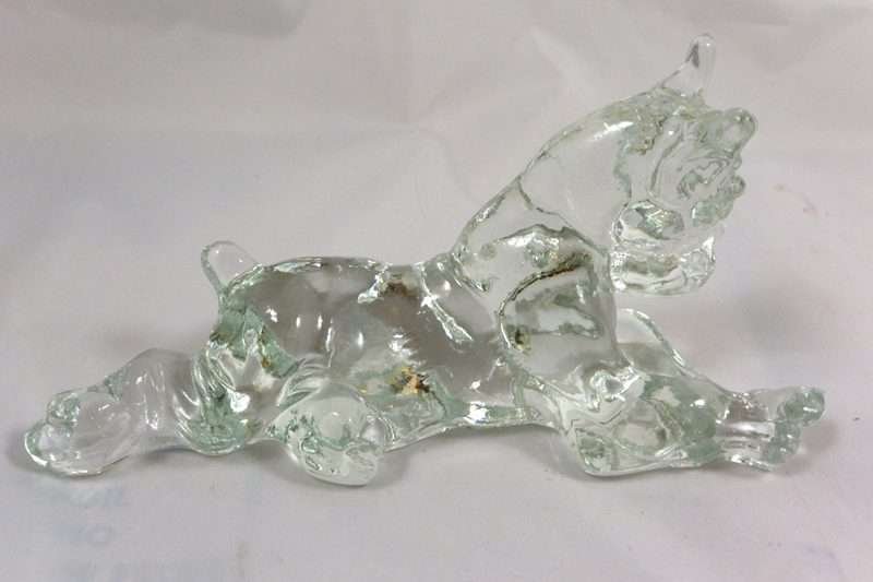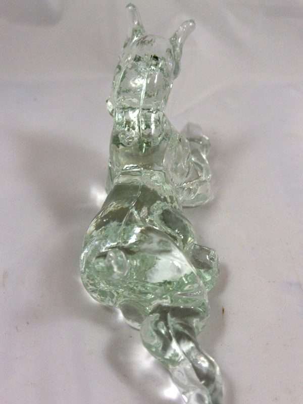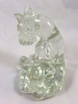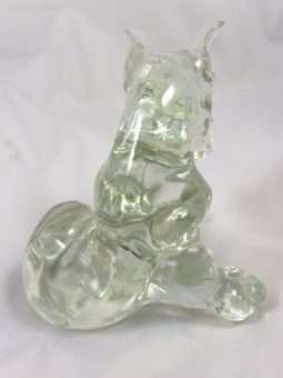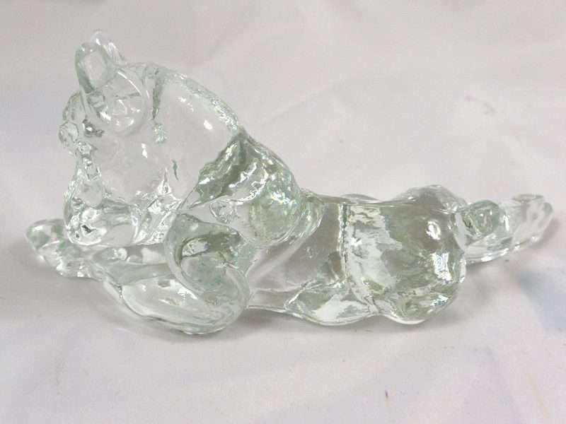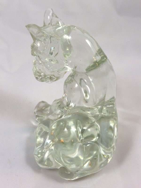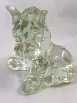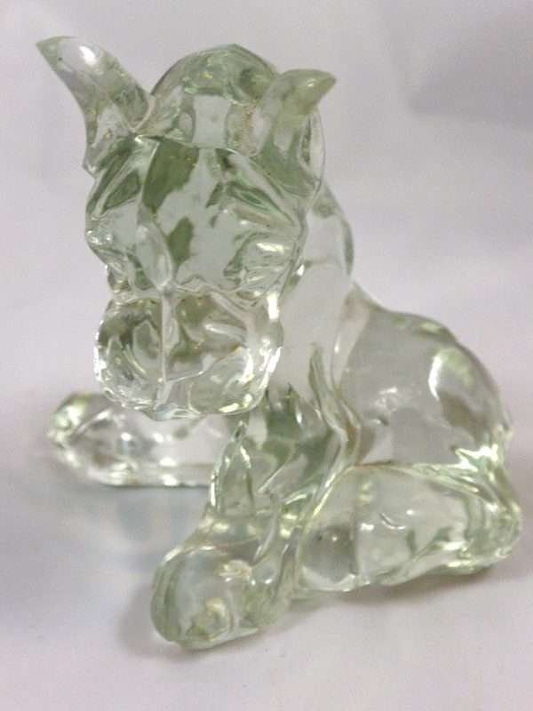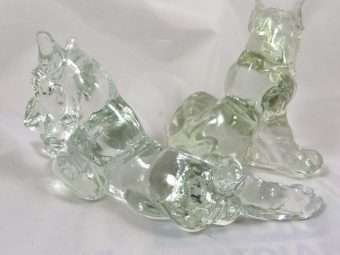 These adorable glass boxers look like the very best of friends. One is stretched out in a comfortable pose, and the other is seated with a sweet and curious expression on it’s face. These pieces were produced by The American Glass Company. See full details below.