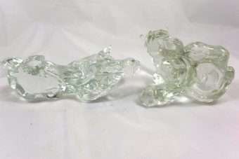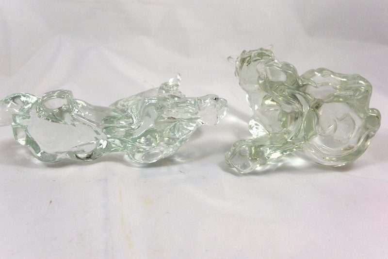 These adorable glass boxers look like the very best of friends. One is stretched out in a comfortable pose, and the other is seated with a sweet and curious expression on it’s face. Both will immediately remind you of those wonderful “puppy days” with your boxer! They were designed by Kenneth R. Haley (1946-1973), a master glass mold maker and the son of Reuben Haley, also a well- known glass designer. These pieces were produced by The American Glass Company. We are offering these two pups for sale as a pair because they look so amazing together! Sold as a set.