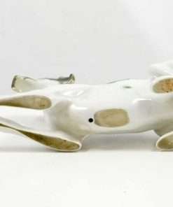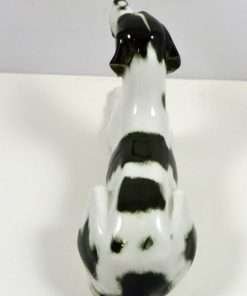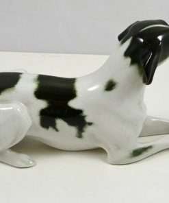 This striking black & white, Pointer dog was hand-made and hand-painted in the Lomonosov porcelain factory in St. Petersburg. Founded in 1744, by Peter the Great’s daughter, Empress Elizabeth, Lomonosov porcelain is one of the oldest porcelain manufacturers in Europe. The quality, demanded by the Imperial Romanov family, can still be found two and a half centuries later. This magnificent dog is quite large, reclining at 11 1/2″ long x 6″ tall x 4″ wide. She is in mint condition with a wonderful high gloss finish. She will make a gorgeous, stand alone decorative piece, or a perfect focal piece for any collection. We absolutely know that you will love her even more, once you see her!