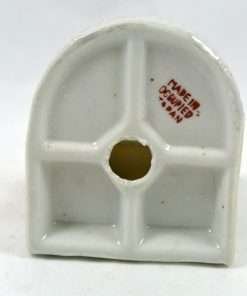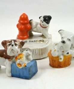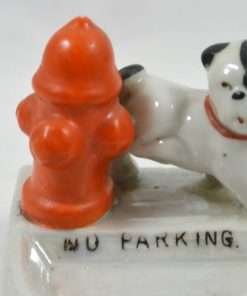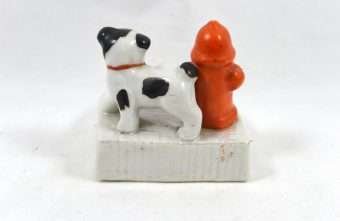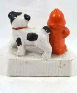 Welcome to our newest obsession! We are just in love with this black and white Bulldog “marking” the bright red fire hydrant! At just 3″ tall x 2 3/4″ long x 2 1/2″ wide, this dog pin tray is in great condition. There are no defects, other than it appears that the glaze has rubbed off on one side of the base. Made in occupied Japan, it dates it within a 7 year period (1945-1952), which makes it not only in terrific shape for being 63-70 years old, but also makes it highly collectible. What we really love are the vivid colors, and of course, the dogs’ “actions” speak much louder than words! Give it as a funny gift, or keep it to remind you to take your dog out! Combine it with other, similar figurines to create a lively, and colorful collection. Take a look at our last picture to get an idea of how well they group together.