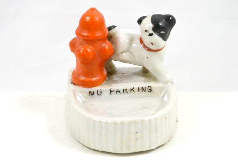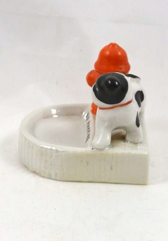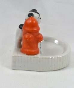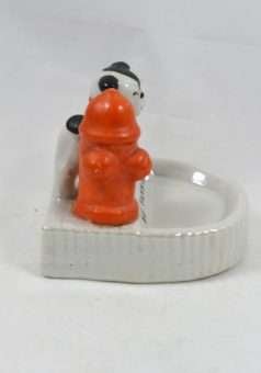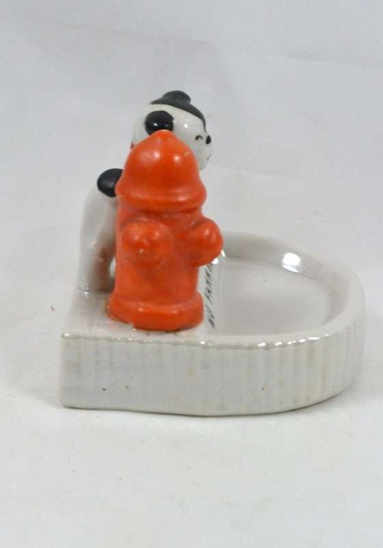 Welcome to our newest obsession! We are just in love with this black and white Bulldog “marking” the bright red fire hydrant! At just 3″ tall x 2 3/4″ long x 2 1/2″ wide, this dog pin tray is in great condition.