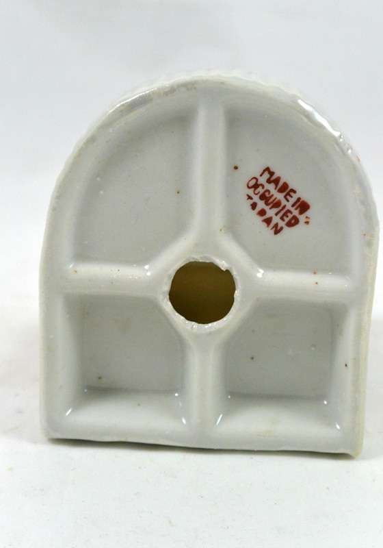 Welcome to our newest obsession! We are just in love with this black and white Bulldog “marking” the bright red fire hydrant! At just 3″ tall x 2 3/4″ long x 2 1/2″ wide, this dog pin tray is in great condition. There are no defects, other than it appears that the glaze has rubbed off on one side of the base. Made in occupied Japan, it dates it within a 7 year period (1945-1952), which makes it not only in terrific shape for being 63-70 years old, but also makes it highly collectible. What we really love are the vivid colors, and of course, the dogs’ “actions” speak much louder than words! Give it as a funny gift, or keep it to remind you to take your dog out! Combine it with other, similar figurines to create a lively, and colorful collection. Take a look at our last picture to get an idea of how well they group together.