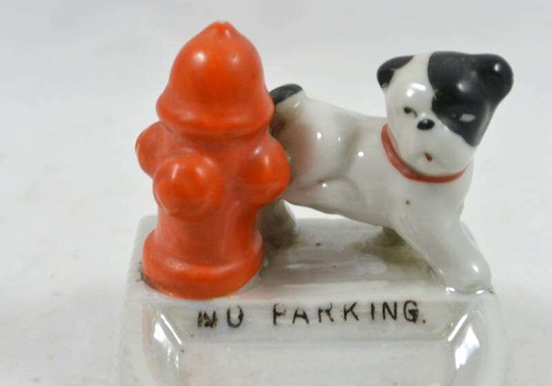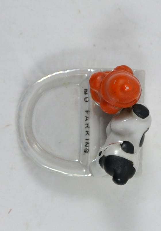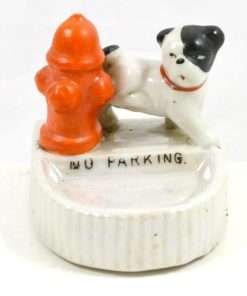 Welcome to our newest obsession! We are just in love with this black and white Bulldog “marking” the bright red fire hydrant! At just 3″ tall x 2 3/4″ long x 2 1/2″ wide, this dog pin tray is in great condition.