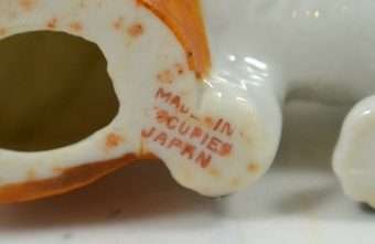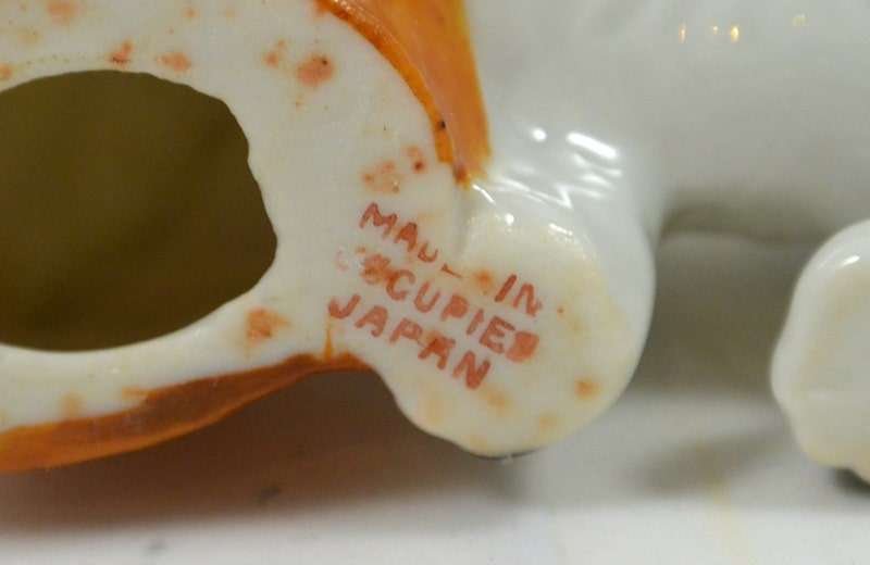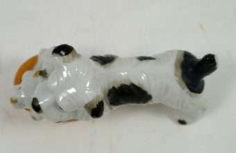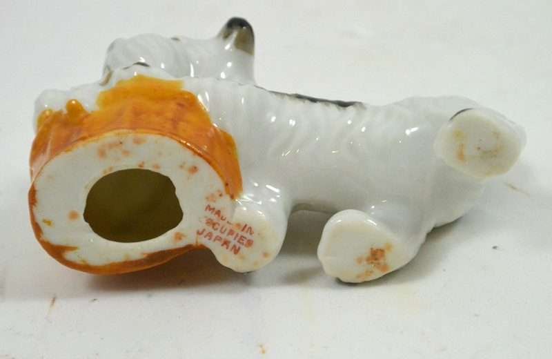 Welcome to our newest obsession! We are just in love with this black and white Terrier dog watching over two adorable puppies! At just 2″ tall x 3 1/2″ long x 1 1/2″ wide, this trio is in excellent condition. Made in occupied Japan, it dates it within a 7 year period (1945-1952), which makes it not only in terrific shape for being 63-70 years old, but also makes it highly collectible.