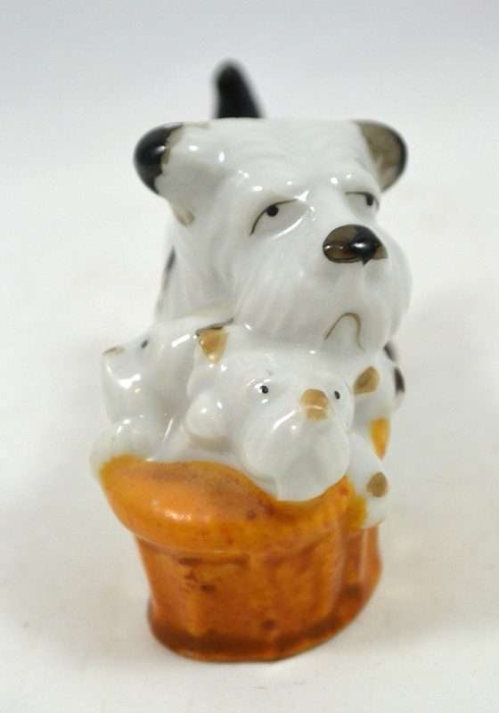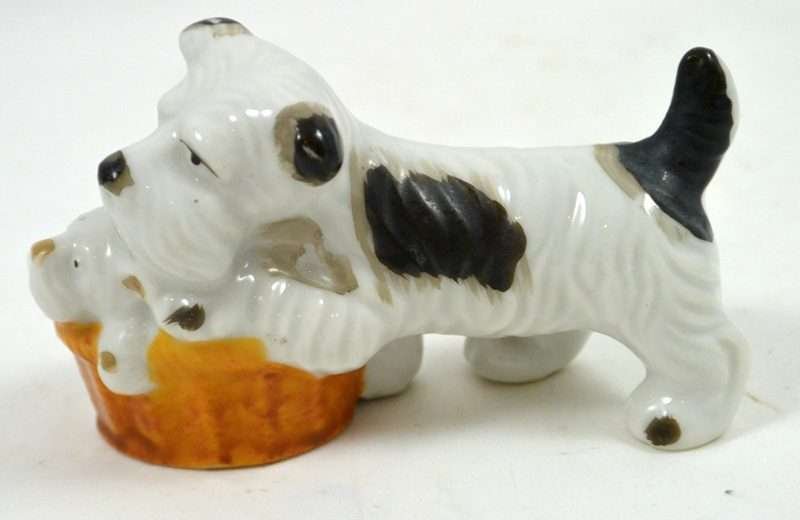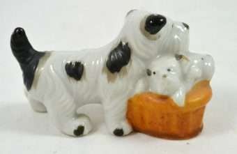 Welcome to our newest obsession! We are just in love with this black and white Terrier dog watching over two adorable puppies! At just 2″ tall x 3 1/2″ long x 1 1/2″ wide, this trio is in excellent condition. Made in occupied Japan, it dates it within a 7 year period (1945-1952), which makes it not only in terrific shape for being 63-70 years old, but also makes it highly collectible. What we really love are the vivid colors, and the dogs’ enormously engaging expressions. Just look at those puppies’ faces! It could be a Mom and her pups, or it could be a Dad giving Mom a break and not knowing how to control the “little ones” other then confining them in a basket that they don’t seem too happy about. Either way, the best part about this figurine are the wonderful stories that with just a touch of imagination, you can spin about it! Give it as a unique and special gift, or combine it with other, similar figurines to create a lively, and colorful collection. Take a look at our last picture to get an idea of how well they group together.