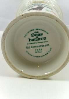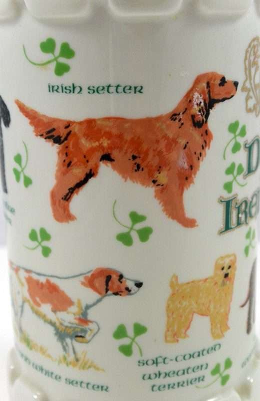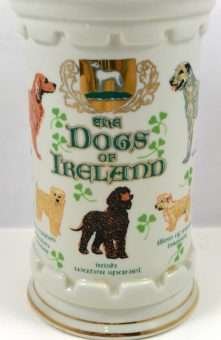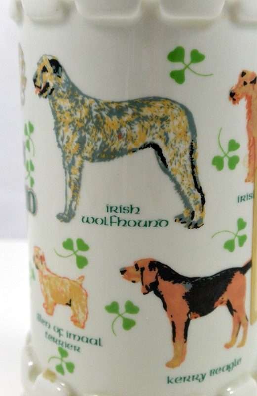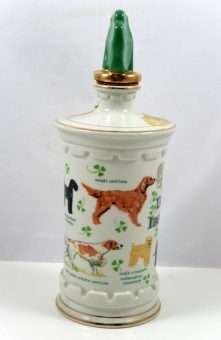 Just in time to be the perfect holiday gift, this fabulous decanter features nine dogs: Soft-Coated Wheaton Terrier, Irish Water Spaniel, Glen Imaal Terrier, Irish Wolfhound, Red & White Setter, Kerry Beagle, Irish Setter, Irish Terrier and the Kerry Blue Terrier. The decanter is elegantly shaped like a castle tower, with “The Dogs of Ireland” and a gold shield on the front. The stopper is a green shamrock with a cork that is in perfect condition and sits securely into the throat of the decanter. At 12″ tall x 12″ in circumference, and able to hold 25.4 FL OZ, this decanter is in excellent condition and retains some of the original paper label which can easily be removed, if you prefer to do so. The underside is well-marked, showing that it is genuine Cumberland Porcelain, a Collector’s Limited Edition, and dated 1980. If you are a lover or owner of an Irish breed, or know someone who is, don’t hesitate to make this fabulous decanter your own!