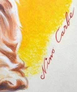 These two animated Sealyham Terrier pups are almost ready to jump off the page! This original, gouache painting was done by artist and Disney illustrator, Nino Carbe (1909-1993). It appears that is was most likely made as an interior illustration for a book. Directions regarding size are in pencil at the bottom, along with pencil lines along the margins. It is signed by Nino Carbe in red ink. Nino Carbe was a notable artist for Disney, illustrating for movies such as “Fantasia, Bambi, and Dumbo”. He also illustrated a number of children’s books for publisher Samuel Lowe Company. This particular painting was done for that line of books c.1950’s. This absolutely adorable portrait of these bright-eyed pups was done on heavy artist’s board and measures !0″ x 10″. The original, clear acetate covering is included, but it is framed to keep it from damage. There is a slight tape residue across the top margin, and minor soiling to the very edges, but the painted area (8″ x 8″) is in excellent condition.