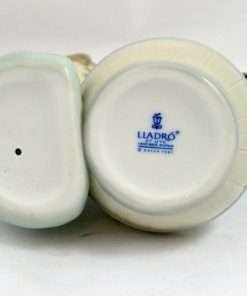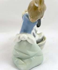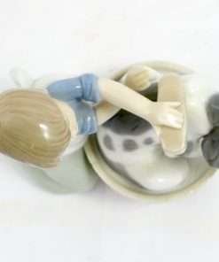 Anyone who has ever given their dog a bath, knows the “look” of a canine who does not really believe that the experience is in his best interest. While this lovely Lladro depicts a energetic young girl giving her Spaniel a bath, one look at the dog’s face, tells you that this figurine is all about the dog! It is in excellent condition, done in the classic Lladro soft blue, beige, cream and grey colors, and finished in a wonderful high gloss. It is 5″ tall x 5 1/2″ long x 3″ wide. Sculpted by Juan Huerta, it was issued in 1988 and retired in 2001. If you have not owned a Lladro before, this is a wonderful way to add a new and engaging piece to your canine figurine collection. For Lladro collectors, this is a great opportunity to add one of their most engaging dogs to your collection.