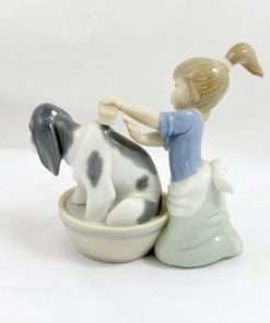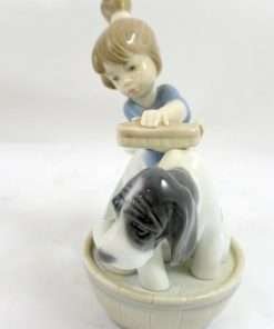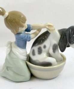 Anyone who has ever given their dog a bath, knows the “look” of a canine who does not really believe that the experience is in his best interest. While this lovely Lladro depicts a energetic young girl giving her Spaniel a bath, one look at the dog’s face, tells you that this figurine is all about the dog!