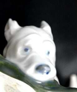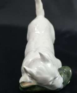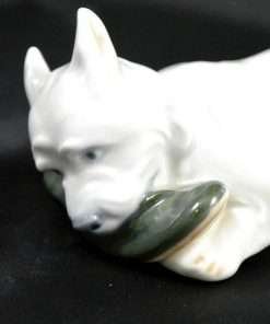 This one’s for Westie-lovers! This frisky West Highland Terrier pup has got a hold of Dad’s slipper, and it doesn’t look like he’s going to give it back anytime soon. This wonderful figurine was designed by Ada Bonfils in 1968, and it is in mint condition. It is done in a high gloss finish in white, deep forest green, tan and touches of grey and black. It measures 3 3/4″ tall x 4″ long x 2 1/4″ wide. It is stamped “Royal Copenhagen Denmark” on the underside, along with the # 3476. It captures perfectly the mischievous “head down, rump up” stance of this playful breed, and is the perfect addition to any Westie collection, or fabulous gift to a Westie-lover!