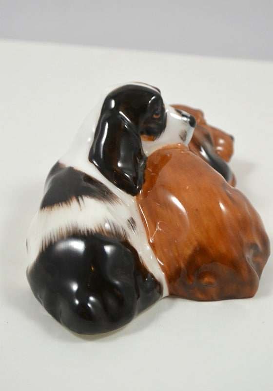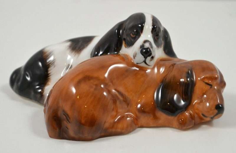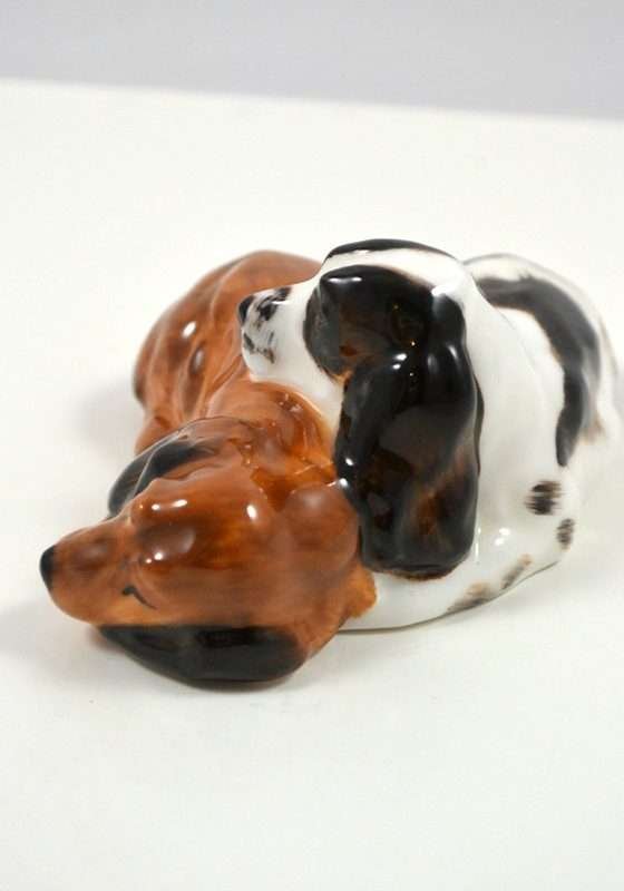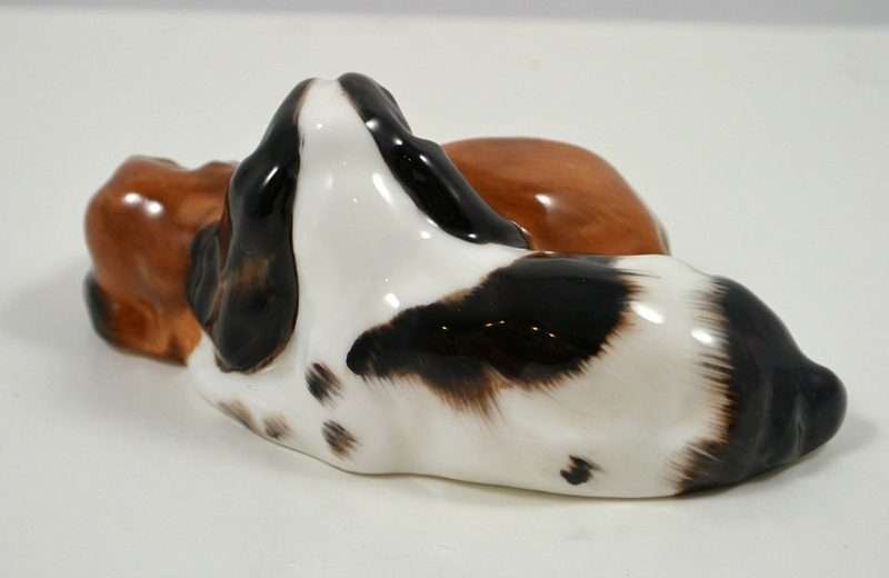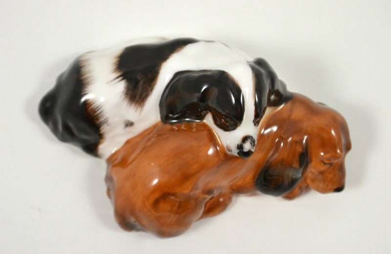 These pups were designed never to be separated and you can certainly see why. As the Cocker Spaniel dozes contently, the Springer Spaniel rests his head, but keeps a diligent watch. This precious pair are by Royal Doulton of England and they have both the early stamped and impressed marks.