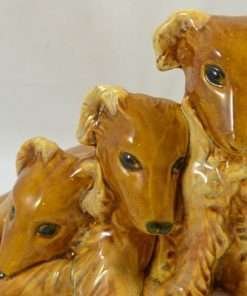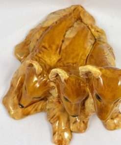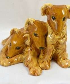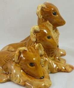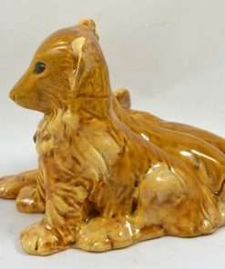 Eric Olsen, who was the lead designer at Royal Haeger between 1944-1972, designed this whimsical and delightful trio of Rough-Coated Collie pups. They are in excellent condition, and done in Amber Glaze with a beautiful, glossy finish. Standing 5 1/2″ tall x 9 3/4″ long x 9″ wide, it is the hardest to find of his Collie dog figurines. The color, design, and whimsy of these vintage pups come together to create a truly unique, beautiful, and highly collectible piece. Whether you are a lover of the breed, a collector, or an individual with an “eye” for decorative works of art…this “Bunch O’ Collie Pups” is hard not to love!