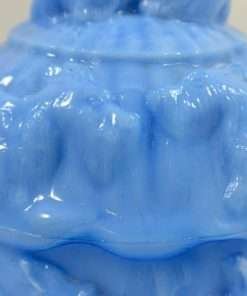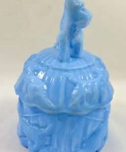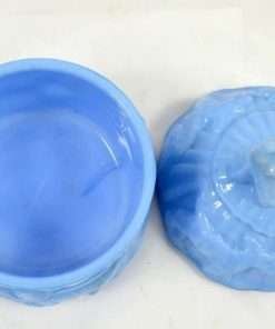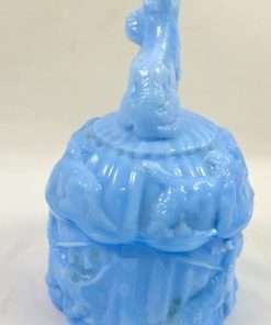 You can't help but fall in love with this whimsical, covered vanity jar! Made between 1939-1942, by the Akro Agate Company in Clarksburg, West Virginia, (the company so famous for its marbles), it is done in a beautiful light blue slag glass, with a few white highlights, which are typical to slag glass.