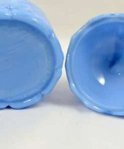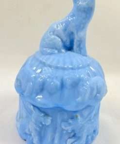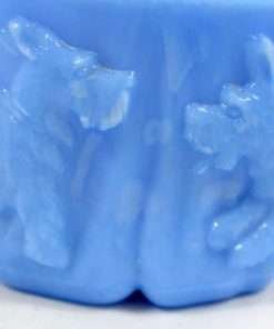 You can’t help but fall in love with this whimsical, covered vanity jar! Made between 1939-1942, by the Akro Agate Company in Clarksburg, West Virginia, (the company so famous for its marbles), it is done in a beautiful light blue slag glass, with a few white highlights, which are typical to slag glass. There are adorable relief images of Scottish Terrier dogs prancing all around the lid and base…four around the bottom and four around the lid. One additional Scottie pup, sits proudly on the top! It is stamped “Made in U.S. of America” on the bottom. This wonderful powder jar is in excellent condition and is 6″ tall x 3 3/4″ in diameter. The base, or “bowl” part of this covered jar is 2 ” deep, which makes it the perfect size to hold anything from cotton balls to jewelry on your vanity! We would be remiss if we didn’t also suggest that it would make the most wonderful baby gift! Especially given its soft blue color.
