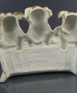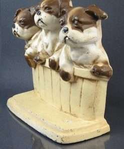 Oh yes, these three pups are looking at you! Each reveals a different personality, but all are adorable, just waiting to be lifted out of their basket/box. This vintage doorstop is painted cast iron, manufactured by John Wright, and cast in Pennsylvania. It is a very detailed casting and it is in good vintage condition with some minor signs of age and a few scattered paint chips. There have not been any “touch ups” to the original paint. We see many vintage cast iron doorstops. This one definitely has CHARACTER!