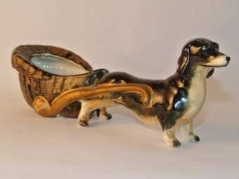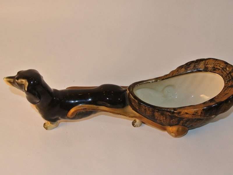 This hardworking dachshund is pulling a cart that resembles a cross between a basket and an oyster shell. This figurine is in good condition with a beautiful glossy finish on the dog and a combination gloss and matte finish on the cart. Could be used as a small planter, or as a place to put small items (jewelry on a vanity, paper clips or stamps on a desk). A unique piece that would add interest and charm to any collection, tabletop, shelf or desk.