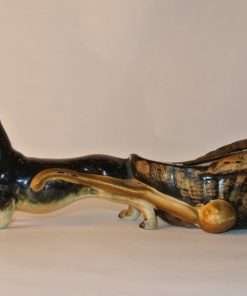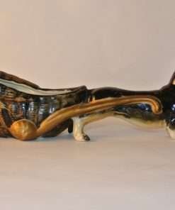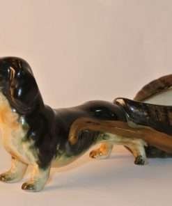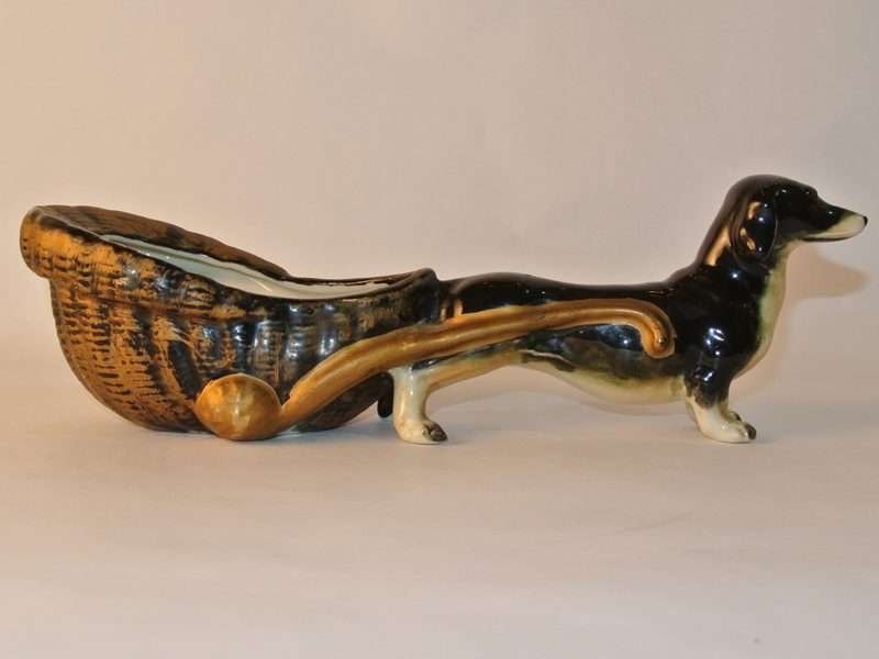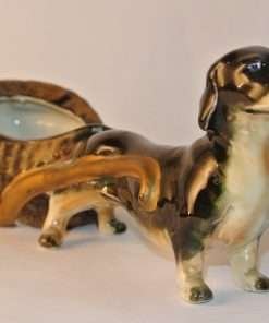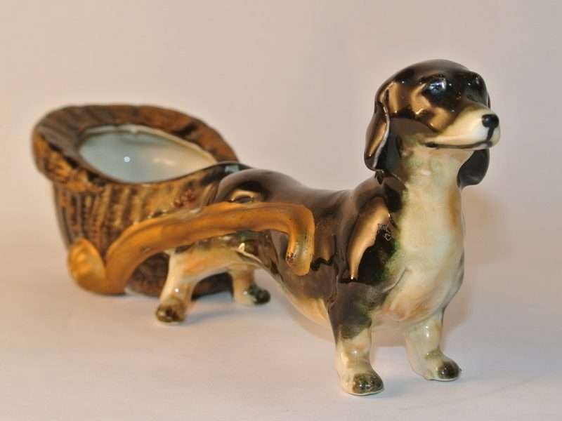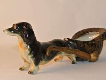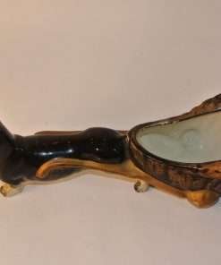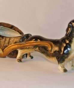 This hardworking dachshund is pulling a cart that resembles a cross between a basket and an oyster shell. This figurine is in good condition with a beautiful glossy finish on the dog and a combination gloss and matte finish on the cart. Could be used as a small planter, or as a place to put small items (jewelry on a vanity, paper clips or stamps on a desk). A unique piece that would add interest and charm to any collection, tabletop, shelf or desk.