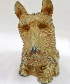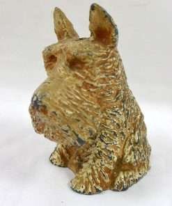We were so lucky to find this old guy with his key! Made of cast metal and once painted white and tan, he has lost paint, but not his personality. A more distinguished-looking fellow would be hard to find! He sits 5″ tall x 3 3/4″ long x 2 3/4″ wide. He opens and closes with ease with his original key. What a great dog to add to any vintage collection, or sit quietly on your desk, collecting loose change for your next canine rescue donation! A wonderful dog to give to a child to teach the importance of saving money and cherishing things from the past. This dog has a lot of love left to give to someone who will love him in return!