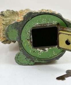 We were so lucky to find this old guy with his key! Made of cast metal and once painted white and tan, he has lost paint, but not his personality. A more distinguished-looking fellow would be hard to find! He sits 5″ tall x 3 3/4″ long x 2 3/4″ wide. He opens and closes with ease with his original key.