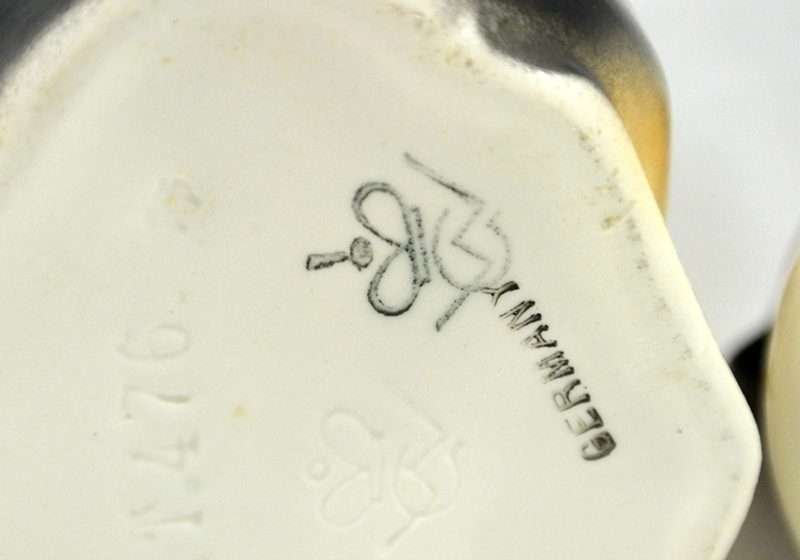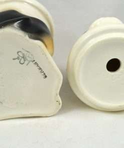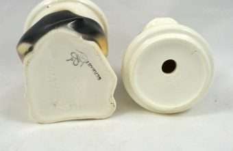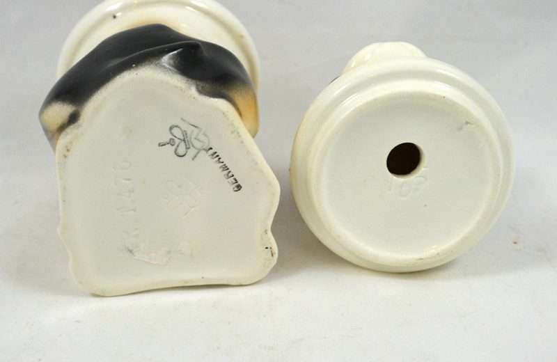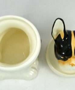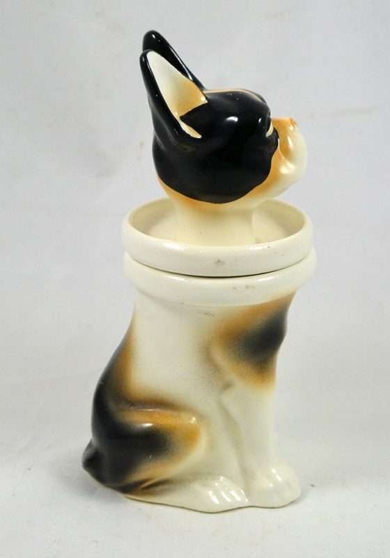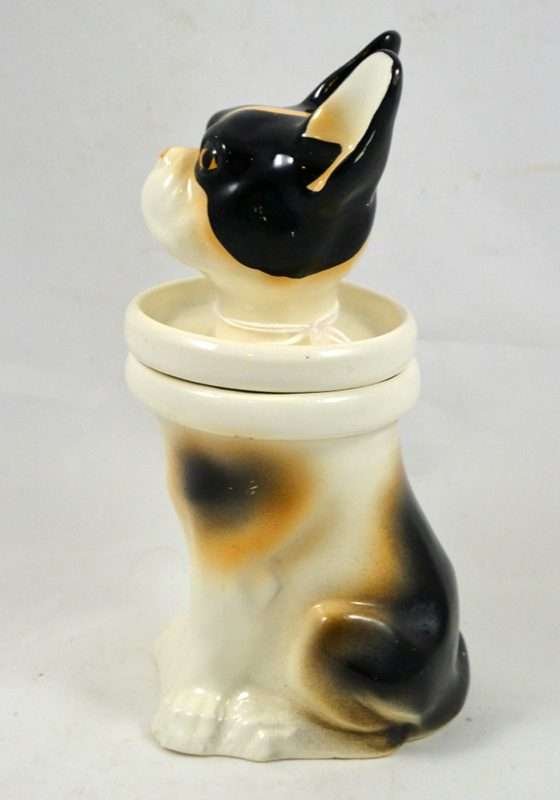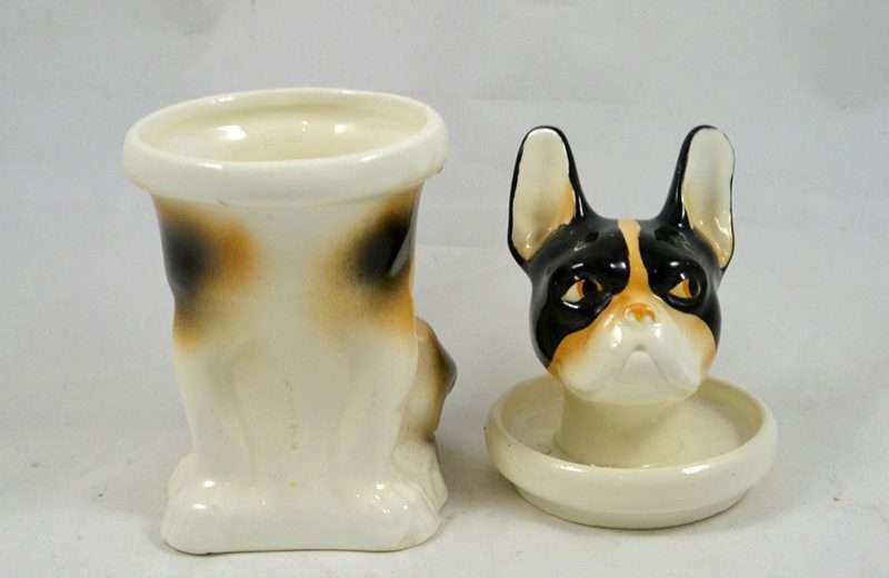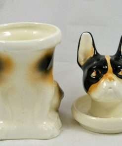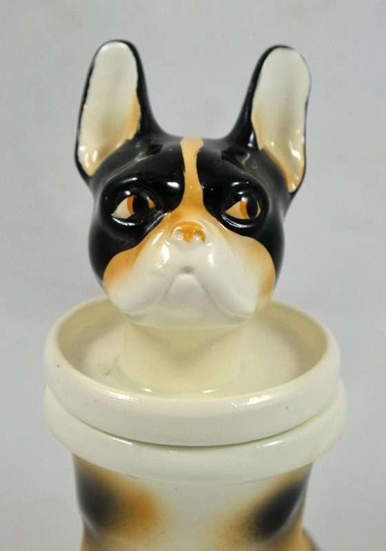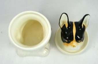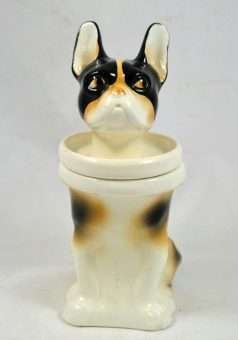 So unusual and unique, this whimsical, porcelain French Bulldog is also a jar. Its markings tell us that it is a Schaubach-Kunst from the Wallendorf porcelain factory, Thuringia, Germany, made between 1963 through the 1980’s. He sits 6″ tall x 2″ wide x 3″ long and he is in excellent condition, with a few tiny “flea flicks” on the top of his head. The inside of this piece is immaculately clean and shiny. Whether he is placed on a desk, vanity, or kitchen counter, he is an absolutely captivating piece for both French Bulldog owners and lovers of this breed.