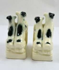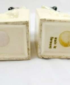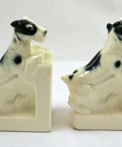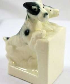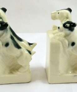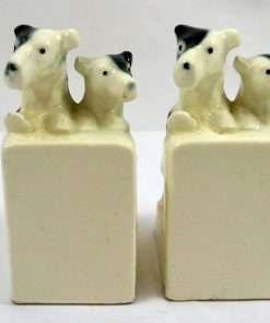 These Terrier pups are so engaging, you’ll want to reach out and pet them! With their hind paws firmly planted on the ground and their front paws atop what looks to be a wall, this pair of Terriers are beautifully detailed, and done in a high gloss creamy vanilla, black and soft grey. A matching pair makes the second bookend. They are marked “Germany” and incised with the #2484. There is a very tiny chip on the top of one of the smaller dog’s ears, as well as chip at the very bottom corner of the base of the other bookend. These flaws are barely noticeable, and standing 4 1/4″ tall x 3″ long x 1 3/4″ wide each, they are in otherwise excellent condition. A unique addition to any porcelain Terrier collection, or a sweet decorative set for a children’s bookshelf.