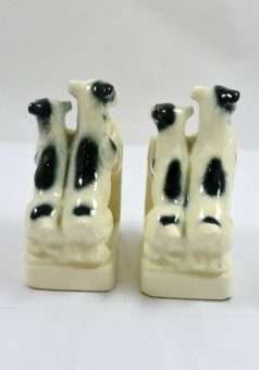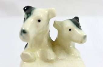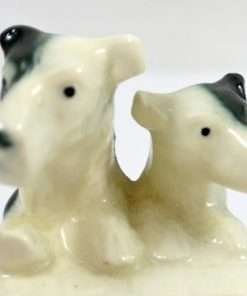 These Terrier pups are so engaging, you’ll want to reach out and pet them! With their hind paws firmly planted on the ground and their front paws atop what looks to be a wall, this pair of Terriers are beautifully detailed, and done in a high gloss creamy vanilla, black and soft grey.