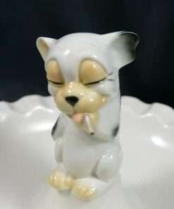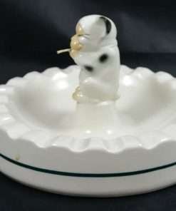 If you are a Bonzo collector, than this piece is a “must-have”! If not, you will still totally enjoy this whimsical character piece. Although it was originally designed as a large ashtray, it can also easily be used as a candy or trinket bowl. It is all done in a bright white, high gloss with a dark navy blue stripe around the circumference of the bowl. Bonzo sits in the center, and he is done in exceptional detail. However, what makes this piece truly exceptional is that Bonzo actually smokes! He comes with ten tiny cigarettes, that when inserted into his mouth and lit, he blows tiny smoke rings! The ashtray/bowl is 7 3/4″ in diameter and Bonzo, himself sits 2 3/4″ tall. This wonderful Bonzo collectible is in excellent condition, and would make a fantastic conversation piece in an office or den, or a unique gift for that friend who as everything!