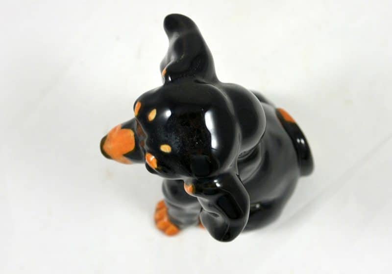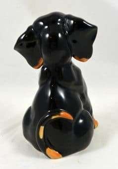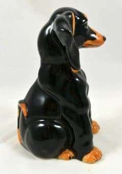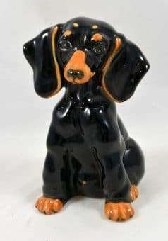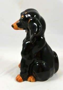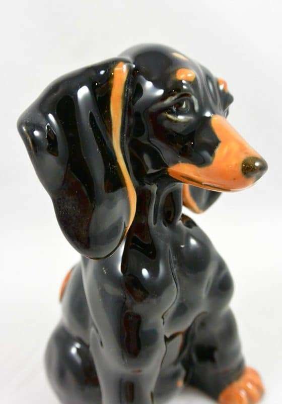 Dachshund lovers, here is a very unique and adorable, black and tan Dachshund to add to your collection. Sitting a full 6″ tall x 4″ long x 3 1/2″ wide, she has the sweetest expression!