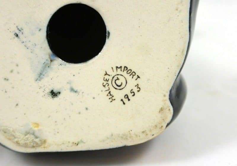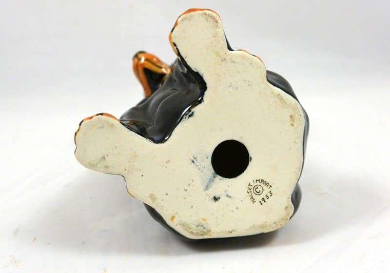 Dachshund lovers, here is a very unique and adorable, black and tan Dachshund to add to your collection. Sitting a full 6″ tall x 4″ long x 3 1/2″ wide, she has the sweetest expression! Made in the USA by the Halsey Company, she is stamped 1953. She is in excellent condition. One look into her beautiful, deep set, eyes, and you won’t be able to resist the urge to take her home!