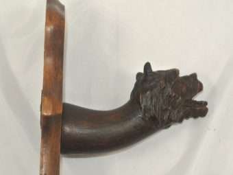 This magnificent hand carved, Black Forest Terrier head hook might have once been used as a whip hook, or one half of a gun rack. The detailing of this dog’s head is extraordinary!