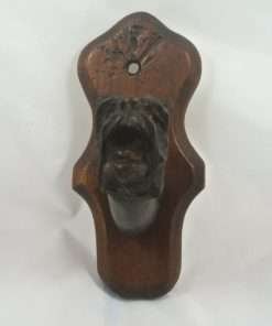This magnificent hand carved, Black Forest Terrier head hook might have once been used as a whip hook, or one half of a gun rack. The detailing of this dog’s head is extraordinary! You can see fur lines, and an open mouth, showing teeth and the dog’s tongue. He has glass inset eyes that look almost real. While the wooden plaque that the dog’s neck is mounted to shows some significant scratches, the dog’s head and neck are in excellent condition. There is a very old metal piece screwed onto the back. This is a “one-of-a-kind” piece that can be re-purposed to use as a leash hook. Or, don’t use it for anything but a decorative piece. It’s fantastic to just look at! If you would like a second one to use alongside this Terrier, or as part of a gallery collection, please see our Vintage Black Forest Boxer Dog Head Hook.