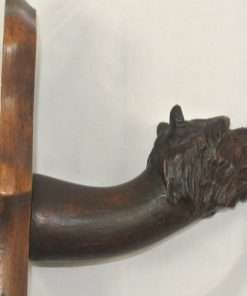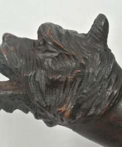 This magnificent hand carved, Black Forest Terrier head hook might have once been used as a whip hook, or one half of a gun rack. The detailing of this dog’s head is extraordinary! You can see fur lines, and an open mouth, showing teeth and the dog’s tongue. He has glass inset eyes that look almost real. See full details below.