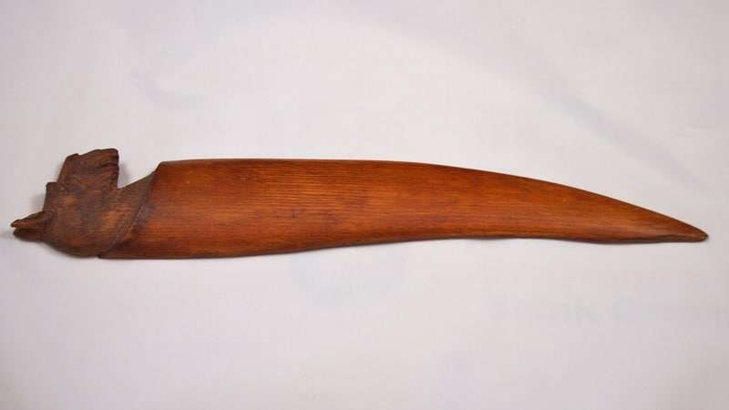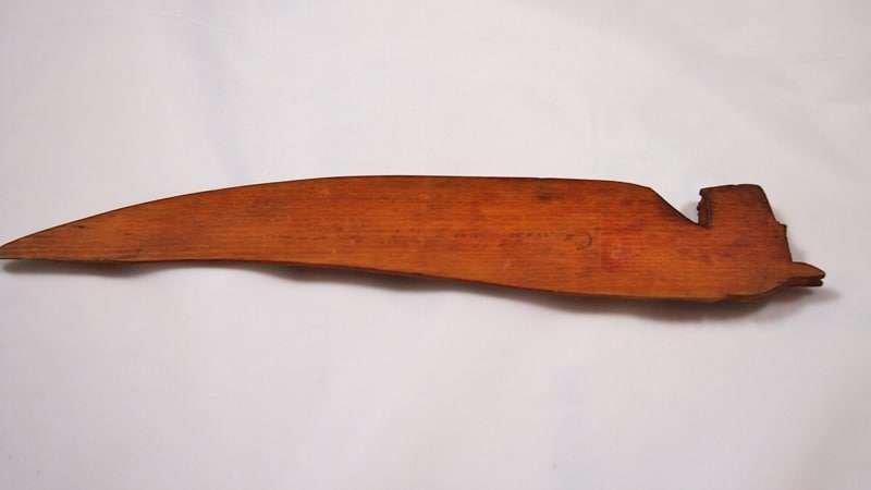 This vintage wood letter opener features a hand-carved head of a Scottie dog. It has beautiful detailing, showing fur lines, eye, nose and ears. The blade is curved and worn smooth by time and use. It has a wonderful warm patina and shows off a beautiful wood grain. Based on the look of this piece, we believe that it could have been made as early as the 1930’s. The back has some minor scratching and what appears to be a signature. It is in great vintage condition with what appears to be a slight sliver off of the edge of the bottom left side of the blade, close to the tip. It does not detract in any significant way from the piece. Although, we don’t use letter openers much anymore, this dog would make a wonderful addition to any desktop, to be used, or as a decorative piece, or even re-purposed as an elegant bookmark.