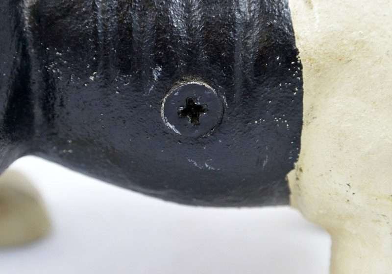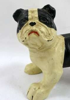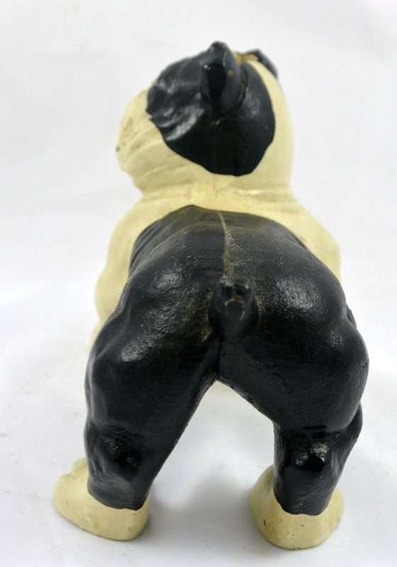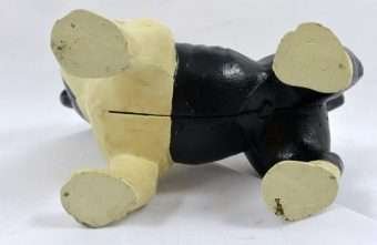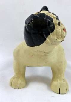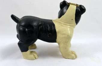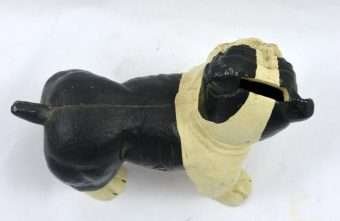 Looks like a Bulldog, painted like a Boston Terrier…our research tells us that a mix between these two breeds is more common than we thought! Standing at 4 1/2″ tall x 6 1/2″ long x 4″ wide, he is a hefty guy that can easily have a dual purpose of a bank and a doorstop.