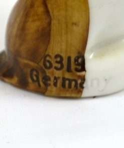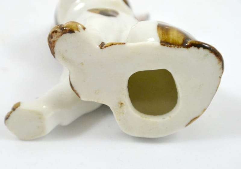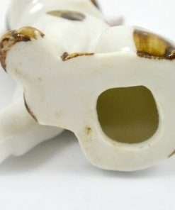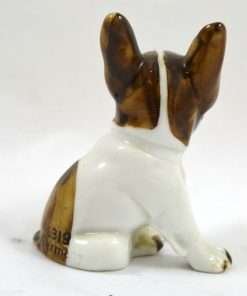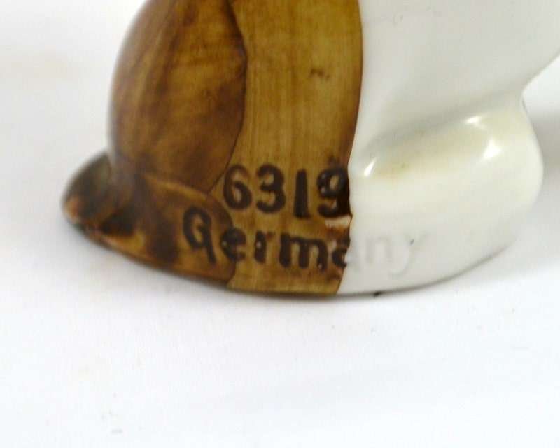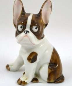 Sitting 3″ tall x 2 1/2″ long x 1 1/2″ wide, this hand painted porcelain French Bulldog is pure personality. Don’t know if it’s his droopy mouth, alert “pop” eyes or his ears, pointing to the sky, that makes him so endearing, but he is truly difficult to pass by without wanting to take him home. He is in excellent condition (white spots you may see in the pictures are just camera reflections off of his high gloss finish.) “Germany” and the # 6319 are incised on his back outer leg. What a fabulous addition he would make to any porcelain canine or French Bulldog collection! If you are thinking of giving him as a gift…BEWARE! He will be tough to give away!