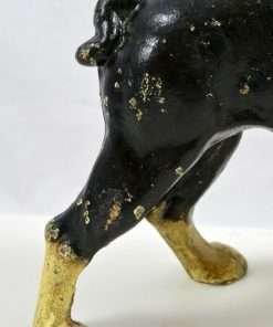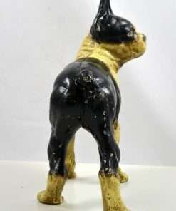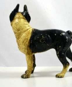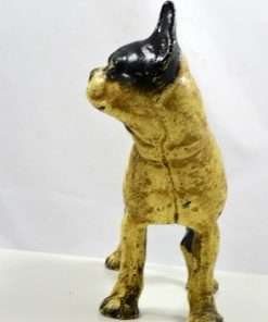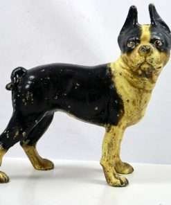 This wonderful Hubley, cast iron Boston Terrier is both a still bank and a doorstop. She stands 9 1/2″ tall x 9″ long x 4″ wide, and has her original paint, screw and he has a coin slot on his back.
