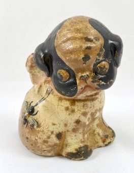 This wonderful child’s cast iron bank was designed by G. Drayton at the beginning of her career. Called “Puppo The Boston Terrier Puppy Dog”, it dates back to the turn of the century, and was made through the 1930’s. It is so similar to the sketch entitled “Stung” by Marguerite Kirmse, which was done in 1931, that one might conclude that one inspired the other! This beauty has the original paint and screw along with missing paint, some rust, and oxidation. Nonetheless, this little sweetheart is adorable with a startled puppy look in her eyes and a pout on her face.