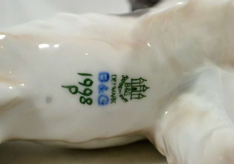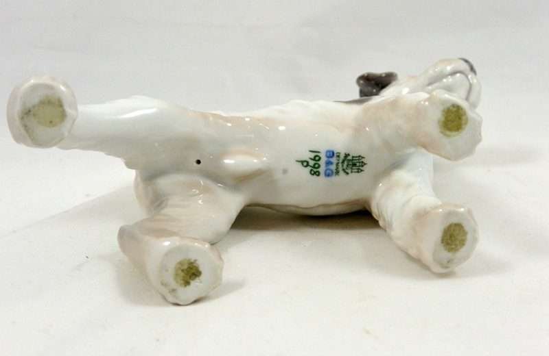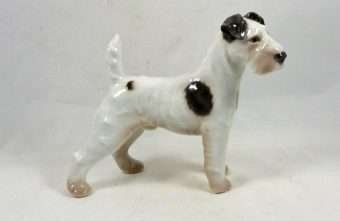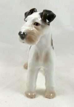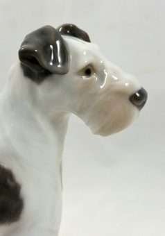 Poised for action, with his eyes fixed and his look focused intently on something in the distance, this beautifully modeled Wire-Haired Fox Terrier is absolutely exquisite. The clean, clear mark on his underside tells us that he is a first quality porcelain, made by Bing & Grondahl of Denmark between 1948-1951. Standing 6″ tall x 7″ long x 3″ wide, he is quite a substantial porcelain and would certainly hold his own elegantly as part of a collection. As a stand alone decorative piece, he is also quite a “charmer”!