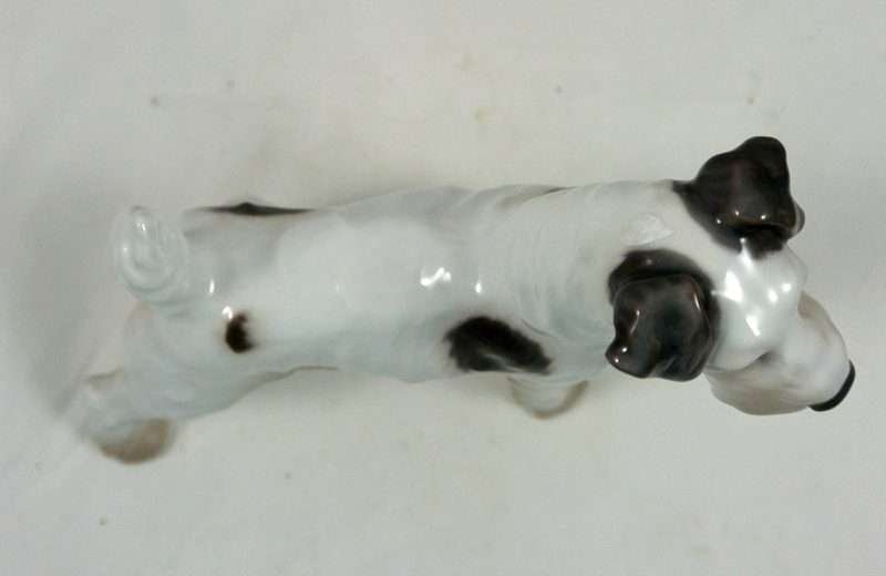 Poised for action, with his eyes fixed and his look focused intently on something in the distance, this beautifully modeled Wire-Haired Fox Terrier is absolutely exquisite. The clean, clear mark on his underside tells us that he is a first quality porcelain, made by Bing & Grondahl of Denmark between 1948-1951.