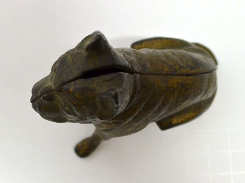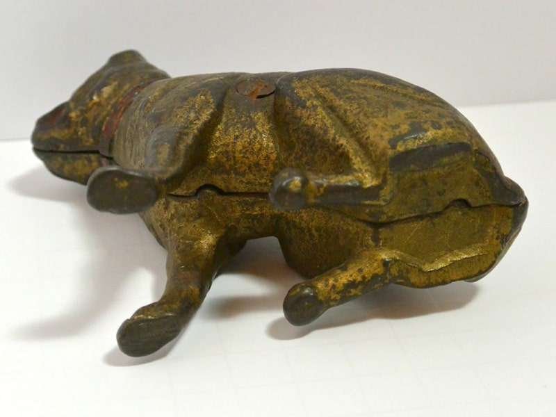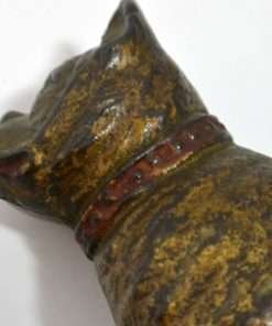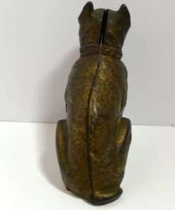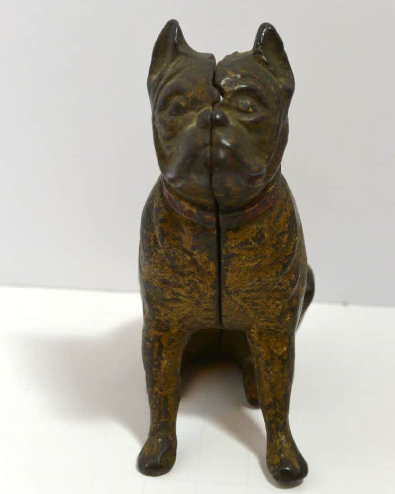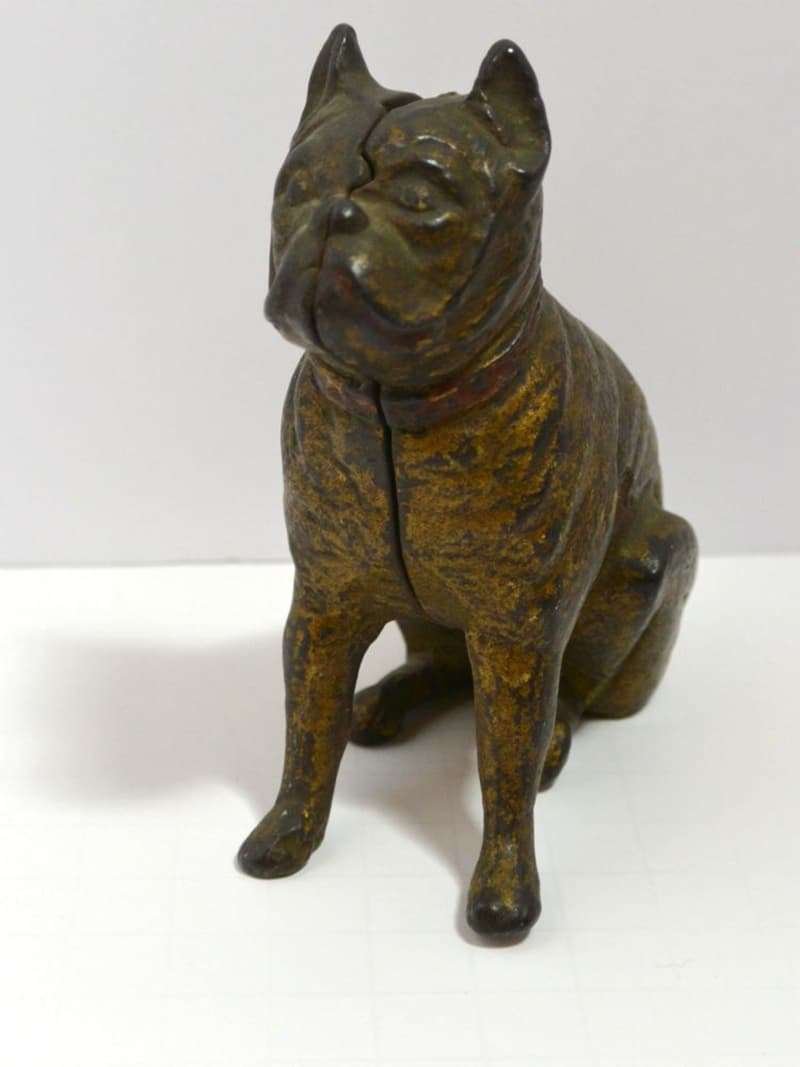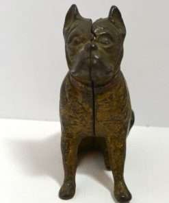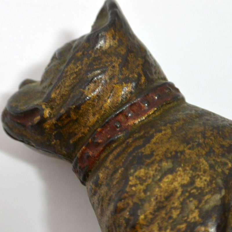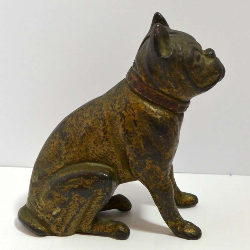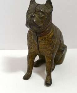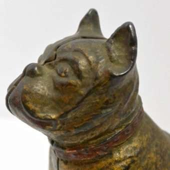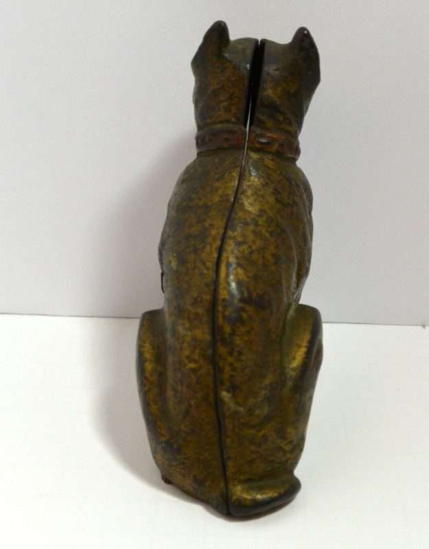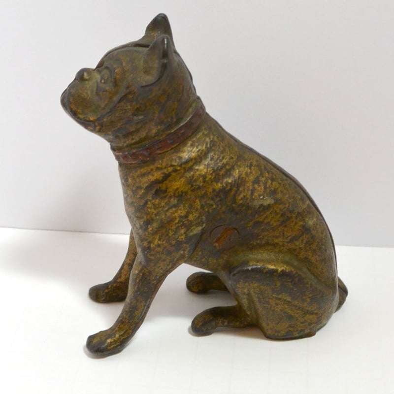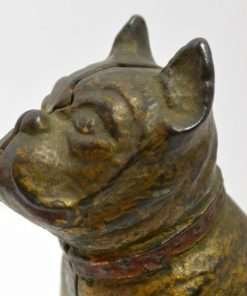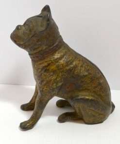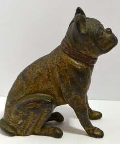 Old and very distinguished-looking, this cast iron still bank is a sitting Boxer dog 4 1/2″ tall x 4″ long x 1 3/4″ wide. He has a wonderful vintage patina and a highly detailed, studded collar that still retains most of its red paint.