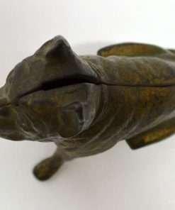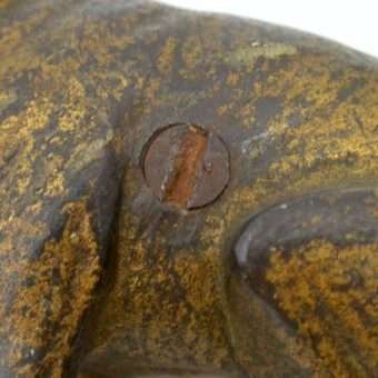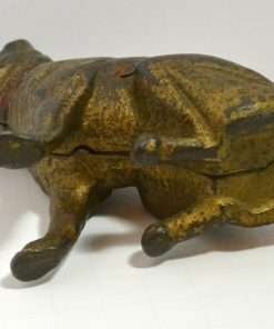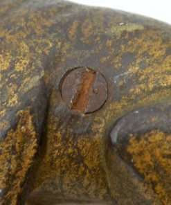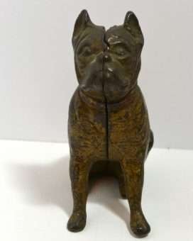 Old and very distinguished-looking, this cast iron still bank is a sitting Boxer dog 4 1/2″ tall x 4″ long x 1 3/4″ wide. He has a wonderful vintage patina and a highly detailed, studded collar that still retains most of its red paint. The screw on his side is also original. If you collect still banks, this gentleman would be a wonderful addition to your collection. Boxer-lovers, this dog is a wonderful collectible and a reminder of just how long the breed has been a favorite!