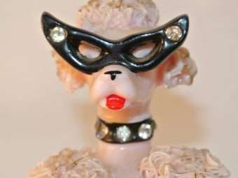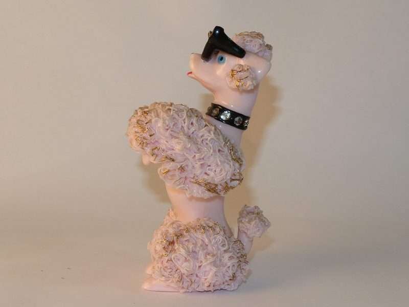 This pretty pink poodle has delicate gold detailing on her pink poodle curls and she is wearing cat’s eye glasses, embellished with two tiny rhinestones. She also has a matching black painted collar, also embellished with tiny rhinestones. See full details below.