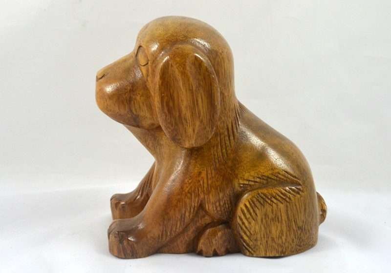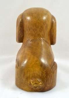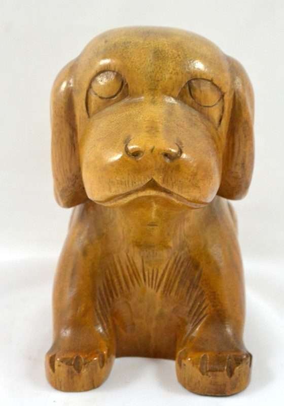 Got Puppy? This wonderful, hand-carved pup captures the “Well, what now?” look that puppies do so well! Sitting almost “Sphinx-like”, he is 5 3/4″ tall x 5 1/2″ long x 3 1/4″ wide. The detailing is terrific. If you like his nose…check out his cute tail! He is in excellent condition, and is just waiting to become your new best friend! As a stand-alone decorative piece, he would look great on a desk, side table or bookshelf. He would also look great amidst other wood carved dogs in a collection.