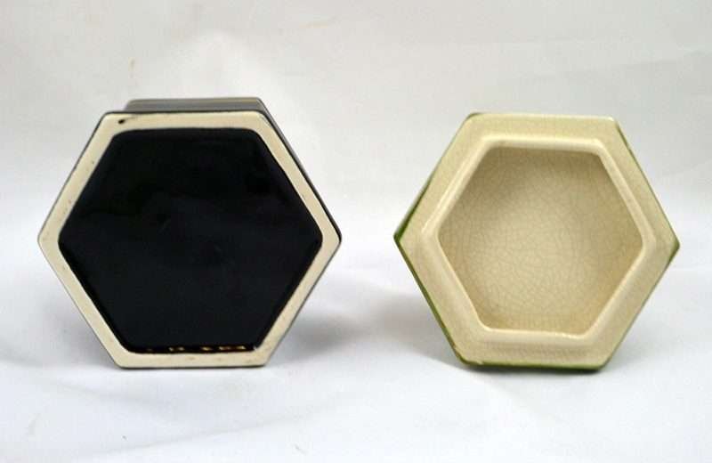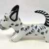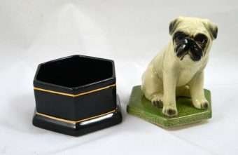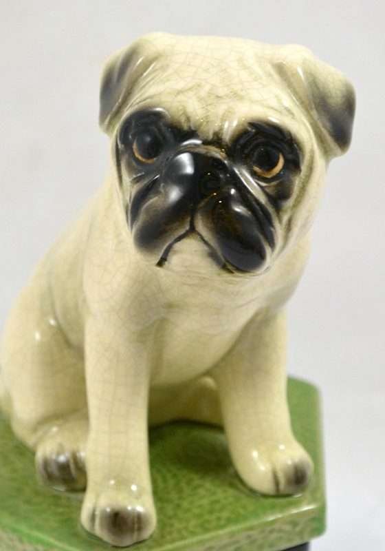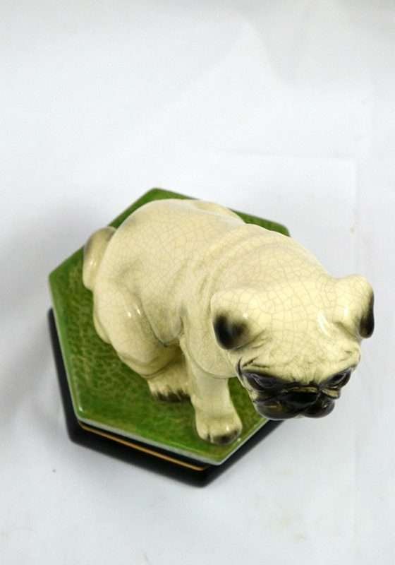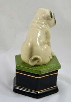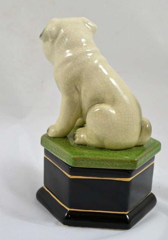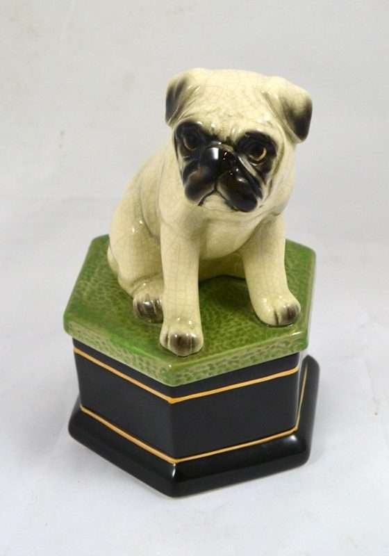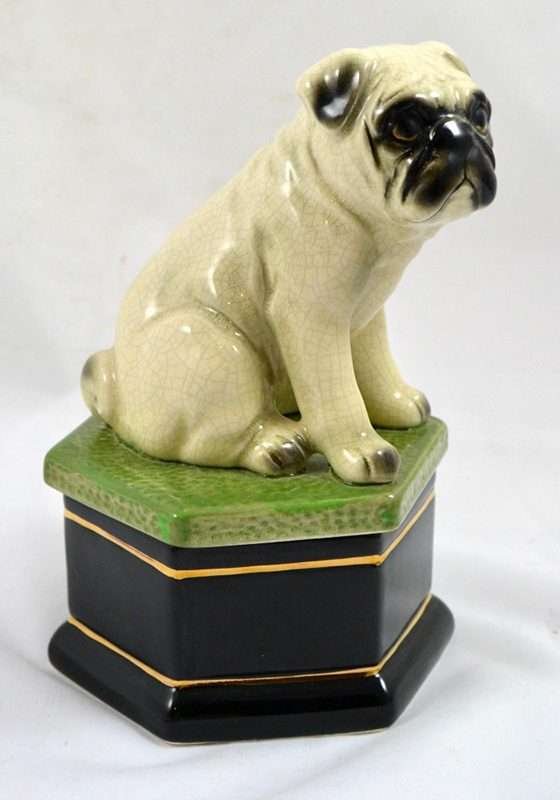 Pug lovers…this one is for you. This wonderful pug is so life like you will want to pet her! With her perfect pug pout and her “chubby” puppy physique, she sits a full 4″ tall on top of a “textured” green cover of a six-sided, 1 3/4″ deep box that is a very dark navy blue, trimmed at the top and bottom in a gold stripe. The pug is a cream color with a touch of soft grey, done in a “crackle” glaze. The overall size of this piece is 6 1/2″ tall x 4 1/4″ wide x 4 1/4″ long, and it is in mint condition. This is absolutely a wonderful and practical addition to any pug dog collection, and she would make a perfect gift for any dog lover…especially a pug owner.