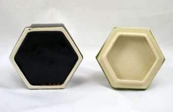 Pug lovers…this one is for you. This wonderful pug is so life like you will want to pet her! With her perfect pug pout and her “chubby” puppy physique, she sits a full 4″ tall on top of a “textured” green cover of a six-sided, 1 3/4″ deep box that is a very dark navy blue, trimmed at the top and bottom in a gold stripe.