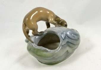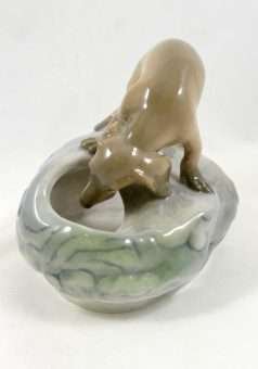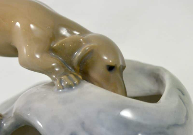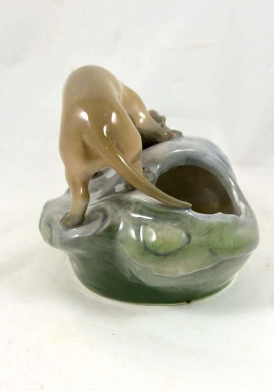 This is a wonderful Royal Copenhagen Dachshund pup, peering inquisitively, into a rock pool. It was modeled by Eric Nielson in 1905 and the Royal Copenhagen backstamp on the bottom of the piece with the model number and painter’s number, dates it to pre-1934.