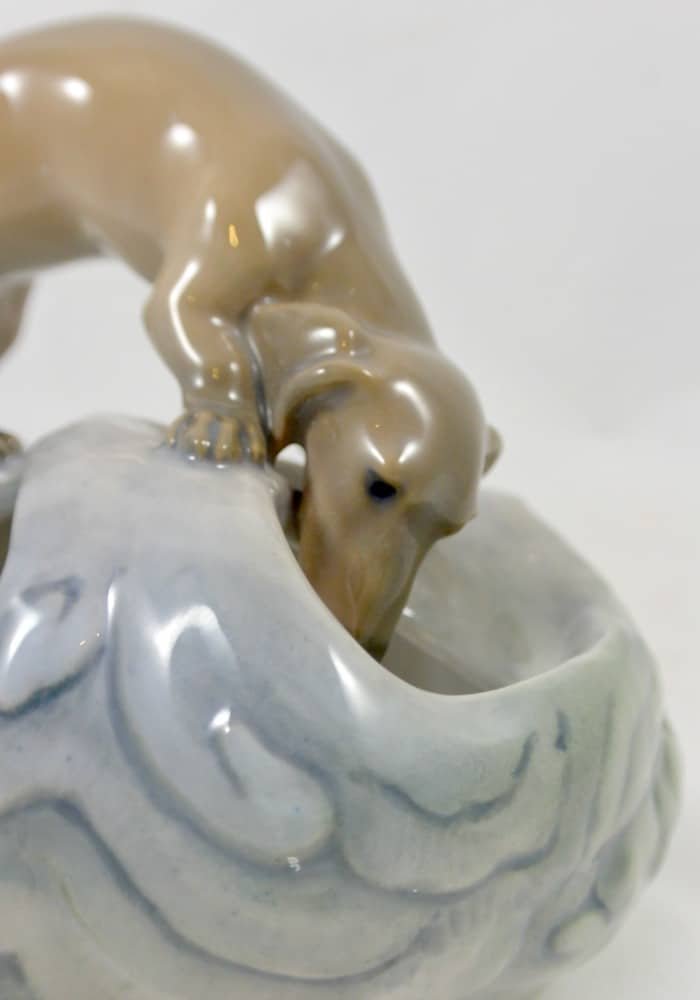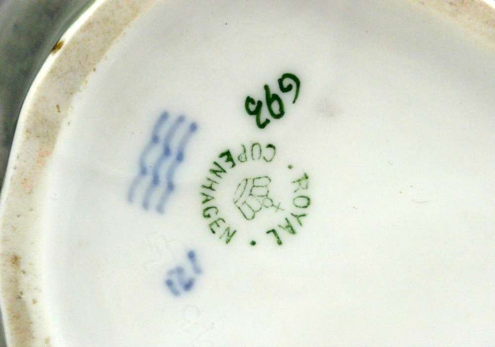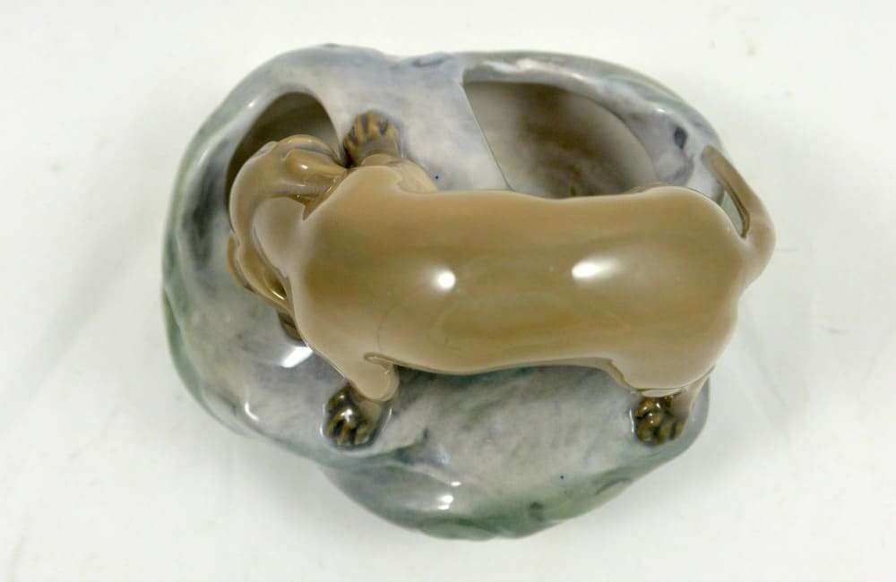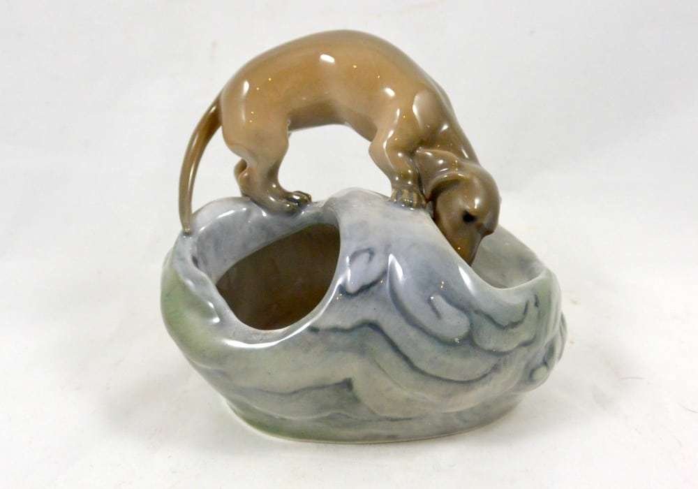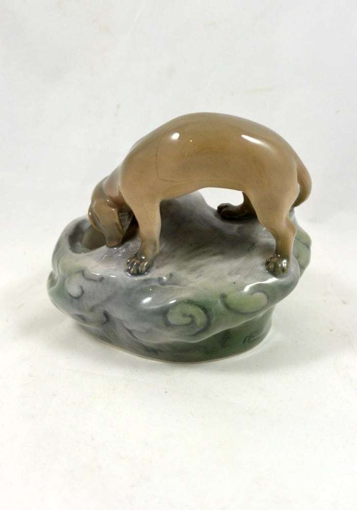 This is a wonderful Royal Copenhagen Dachshund pup, peering inquisitively, into a rock pool. It was modeled by Eric Nielson in 1905 and the Royal Copenhagen backstamp on the bottom of the piece with the model number and painter’s number, dates it to pre-1934.