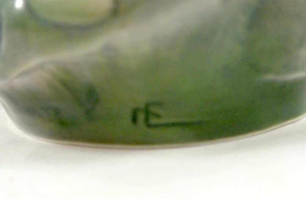 This is a wonderful Royal Copenhagen Dachshund pup, peering inquisitively, into a rock pool. It was modeled by Eric Nielson in 1905 and the Royal Copenhagen backstamp on the bottom of the piece with the model number and painter’s number, dates it to pre-1934. It also has the “Eric Nielson monogram impressed into the side of the base. It is 4 1/4″ tall x 5″ long x 4 1/2” wide. It is in excellent condition with a small hairline crazing on the side of the dog that is very difficult to see, but it is there. This piece is listed on Worthpoint as having sold in 2013 for $800.00. The uniqueness of the design, combined with it’s beautiful “seaside” color palette of swirling blue, grey and sand, make this piece one that will easily attract many admiring looks. It is also a rare opportunity to own an excellent, early example of this seldom offered model at such a reasonable price!