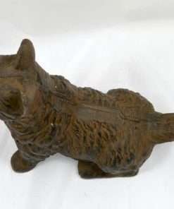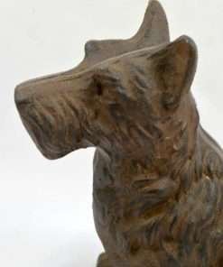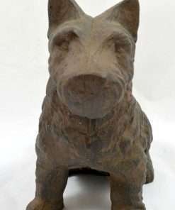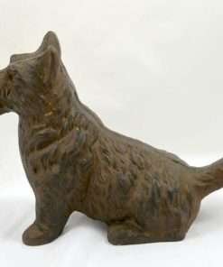 Beautiful detailing shows all over this substantial, cast iron Scottish Terrier figure. He has a vintage rust finish and sits 7″ tall x 10 1/2″ long x 4″ wide. Sitting so attentively, he would make the perfect “guard dog” doorstop, or a wonderful porch or garden figure. A fun gift for a dog-loving friend. He’s quite a “heavyweight”, so our offer of free shipping really makes a difference!