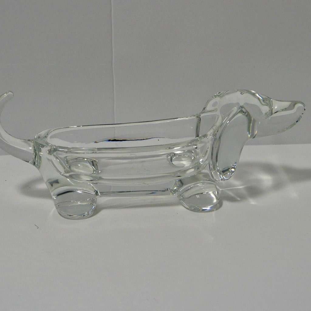 This gorgeous, Dachshund dog candy dish, was created in heavy lead crystal by Vannes Le Chatel in Lorraine, France. This premiere, French glass company was founded in 1765.